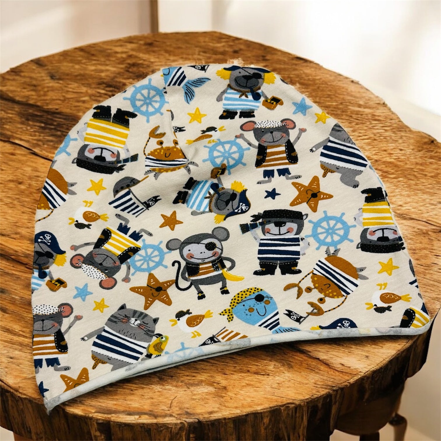 Cappellino artigianale realizzato a mano in jersey di cotone morbido ed elastico, ideale per la pelle delicata dei bambini. Perfetto per le mezze stagioni, protegge la testolina dal fresco mantenendo leggerezza e comfort.