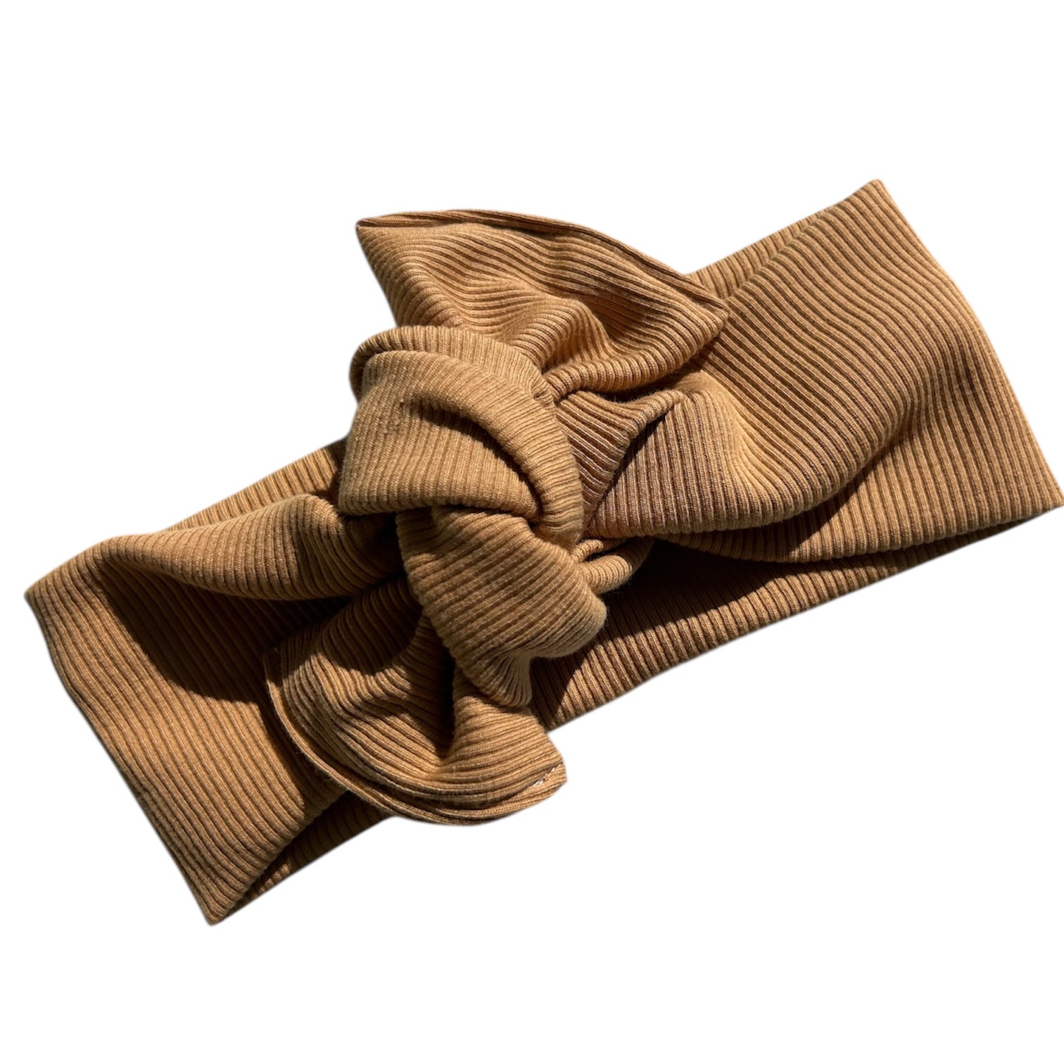Fascia con fiocco in ribbed jersey color cammello – accessorio capelli handmade per bambine 🤎