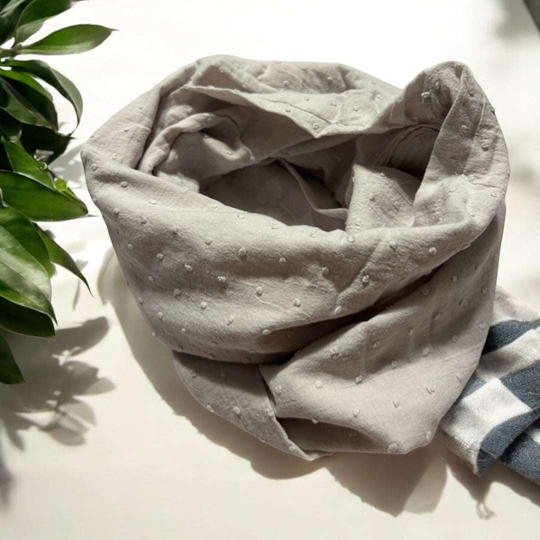 Lasciati avvolgere dalla morbidezza eterea della mussola con il nostro scaldacollo fatto a mano, il complemento perfetto per le giornate autunnali.